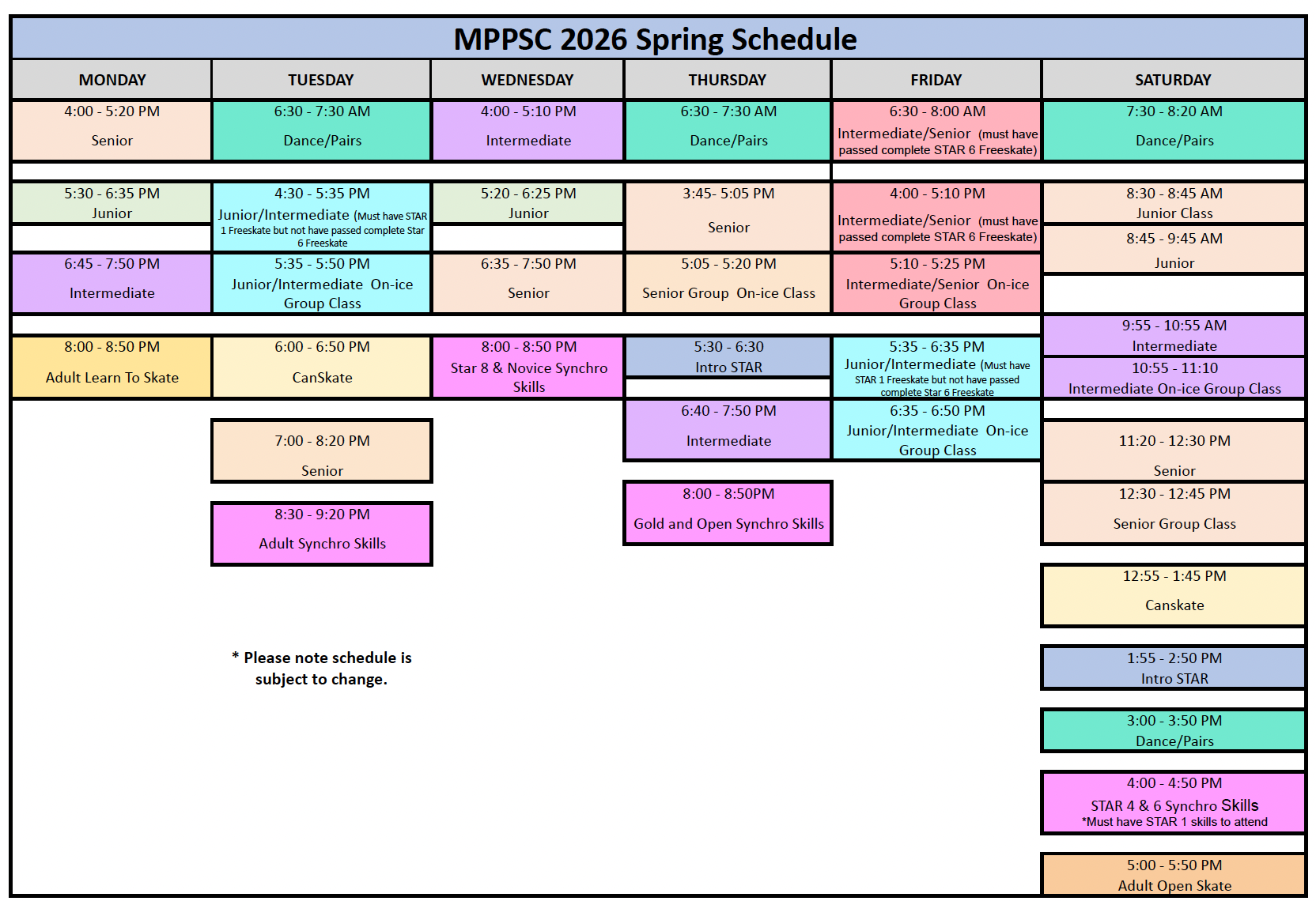 STARSkate/Podium Pathway Session Cancellation & Schedule Change Dates